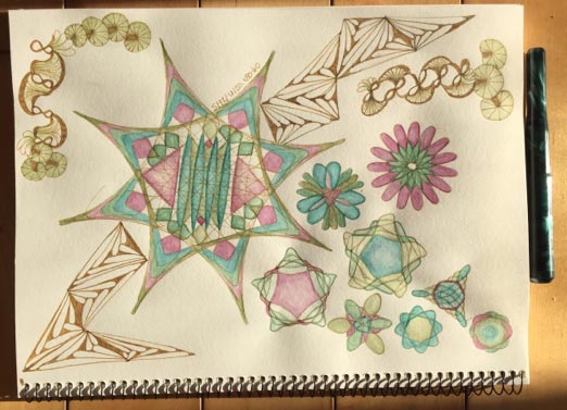 She created a thread on a forum dedicated to fountain pens, showing some of the art she has produced using fountain pens and mixing zentangle components with Wild Gears patterns. She also shows photos showing how her Wild Gears have totally invaded her living space.